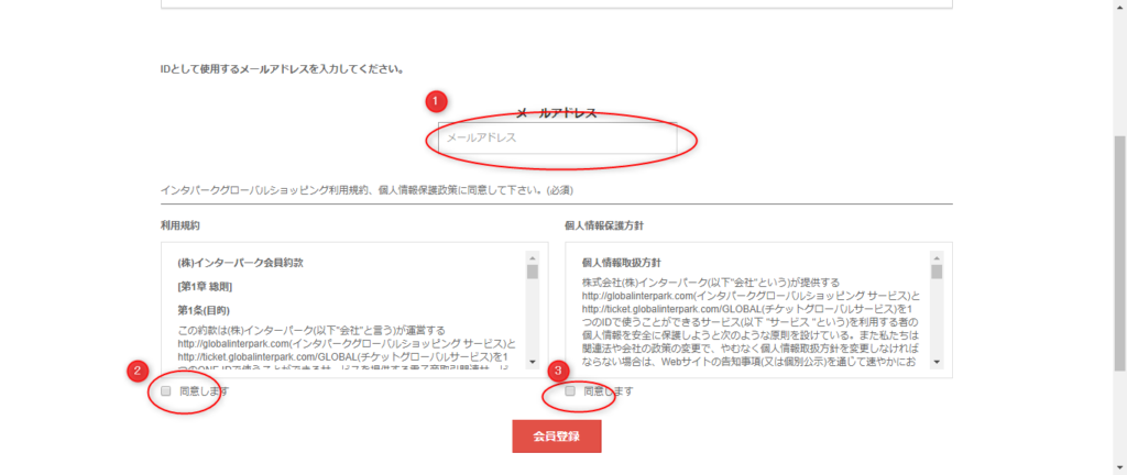 使用するメールアドレスを入力後、利用きやうと個人情報保護方針を読んでからチェックを入れ会員登録ボタンを押します。